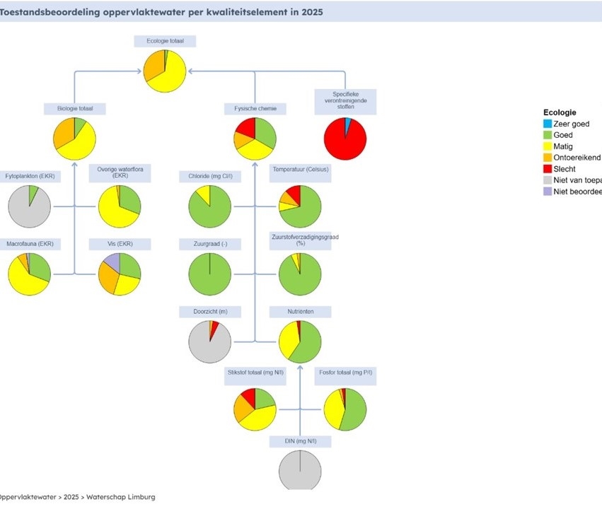 Terug naar navigatie - BBV-indicatoren - Ecologische toestand van oppervlaktewater (BBV) (D_5db)Deze indicator geeft aan in hoeverre de ecologie in de beken op orde is. Daarbij is gekeken naar de aanwezigheid van vissen, waterplanten en kleine waterdiertjes. Het bereiken van een goede ecologische toestand is een van de doelen van de EU-Kaderrichtlijn water. De ecologische toestand van de waterlichamen onder de Kaderrichtlijn Water (KRW) is grotendeels matig. Dit komt zowel door de algemeen fysisch, chemische toestand als de biologische, maar bovenal door de aanwezigheid van specifieke verontreinigende stoffen.