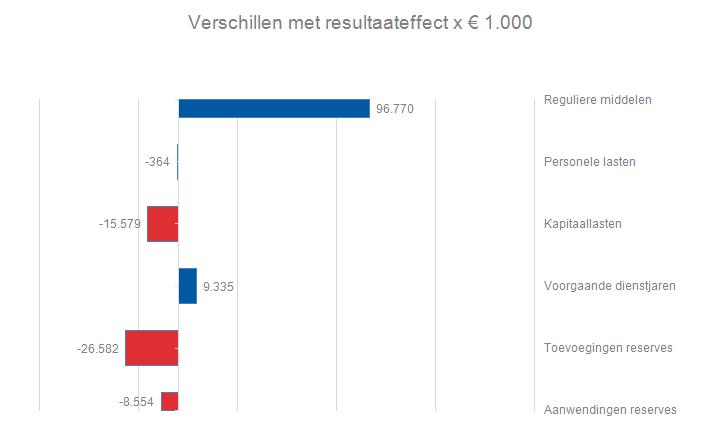 Zoals uit de toelichting blijkt, worden budgetverschillen, zowel baten als lasten, in specifieke gevallen verrekend met bestemmingsreserves. Dat is niet voor elk budget het geval. In het financieel kader van deze jaarstukken treft u een overzicht aan met de belangrijkste posten met resultaatimpact en welke het verschil van € 55,03 mln. verklaren.