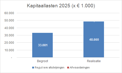 Terug naar navigatie - Overzicht van baten en lasten 2025 - Verschillen in kapitaallastenDe post kapitaallasten in onze jaarrekening 2025 bestaat uit reguliere afschrijvingen op materiële vaste activa (zoals infra en gebouwen) en afwaarderingen van financieel vaste activa.