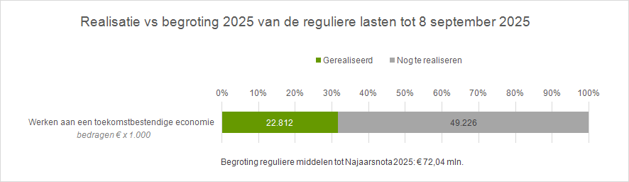 Terug naar navigatie - 3. Werken aan een toekomstbestendige economie - Uitvoering begroting 2025: budgetrealisatieDe lasten van de gewijzigde begroting 2025 voor dit programma tot aan deze najaarsnota bedragen € 83,43 mln., bestaande uit € 72,04 mln. reguliere middelen, € 6,38 mln. personeelskosten en € 5,02 mln. kapitaallasten.