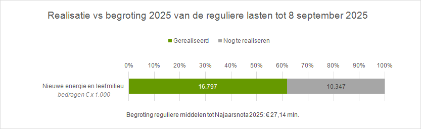 Terug naar navigatie - 4. Nieuwe energie en leefmilieu - Uitvoering begroting 2025: budgetrealisatieDe lasten van de gewijzigde begroting 2025 voor dit programma tot aan deze najaarsnota bedragen € 37,93 mln., bestaande uit € 27,14 mln. reguliere middelen, € 10,78 mln. personeelskosten en € 0,07 mln. kapitaallasten.