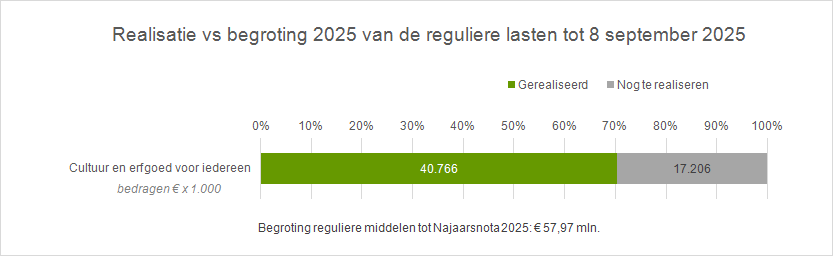 Terug naar navigatie - 6. Cultuur en erfgoed voor iedereen - Uitvoering begroting 2025: budgetrealisatieDe lasten van de gewijzigde begroting 2025 voor dit programma tot aan deze najaarsnota bedragen € 60,17 mln., bestaande uit € 56,76 mln. reguliere middelen, € 2,07 mln. personeelskosten en € 1,34 mln. kapitaallasten.