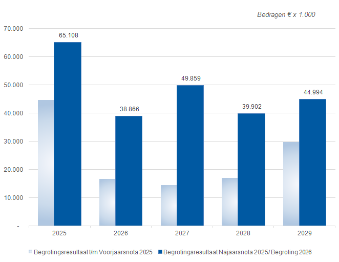 Terug naar navigatie - Financieel perspectief - Ontwikkeling begrotingsresultaatHet begrotingsresultaat voor 2025 is € 20,51 mln. hoger dan in de Voorjaarsnota 2025. In de onderstaande tabel staan alle veranderingen die het begrotingsresultaat beïnvloeden. De cijfers voor de jaren 2026-2029 zijn gebaseerd op het voorstel voor de Programmabegroting 2026. In de Programmabegroting 2026 wordt de ontwikkeling van het begrotingsresultaat gedetailleerd beschreven. Het verschil tussen het verwachte resultaat voor 2025 in vergelijking met 2026 t/m 2029 wordt met name veroorzaakt door enkele incidentele vrijvallen zoals de vrijval van de reserve voor VDL Nedcar. Ten opzichte van de Voorjaarsnota is het beeld structureel verbeterd als gevolg van hogere inkomsten uit rente en de opcenten MRB.