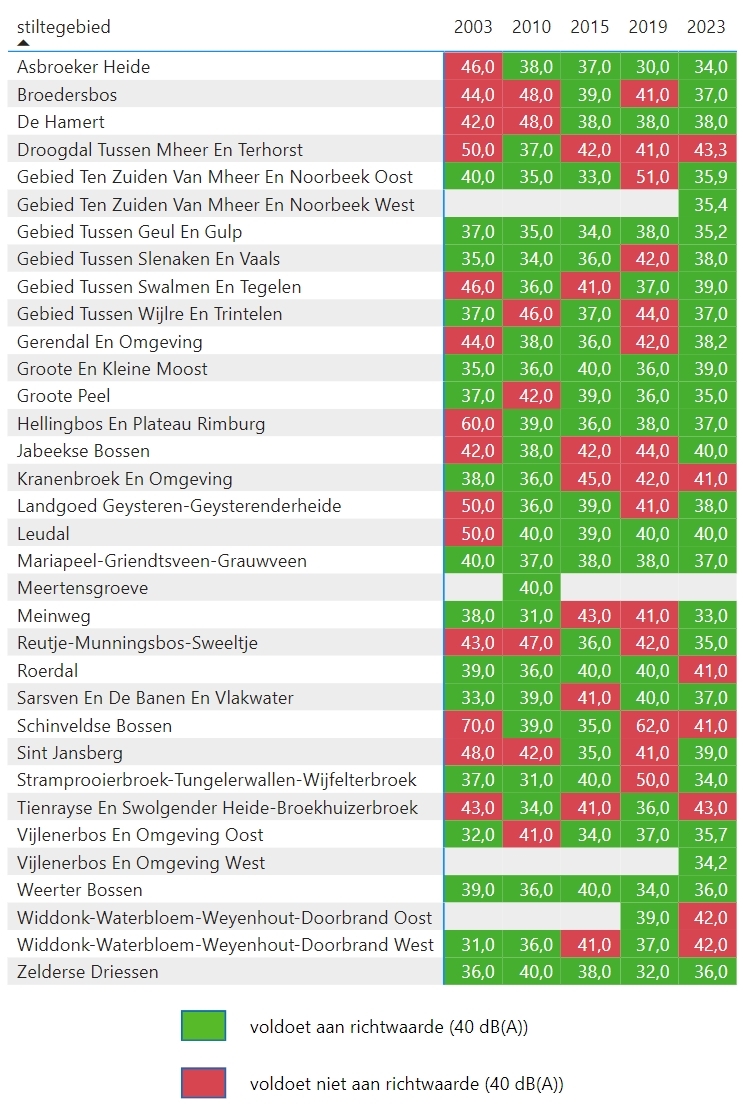 Over de jaren heen wordt de richtwaarde van 40 dB(A) in een meerderheid van de gebieden gehaald. De verbeterde prestatie van de gebieden in 2023 wordt mogelijk voor een deel verklaard uit de in 2022 gelanceerde stiltecampagne waarin ten behoeve van de flora en fauna op de belangrijke waarde van stilte en rust in de gebieden is gewezen.
